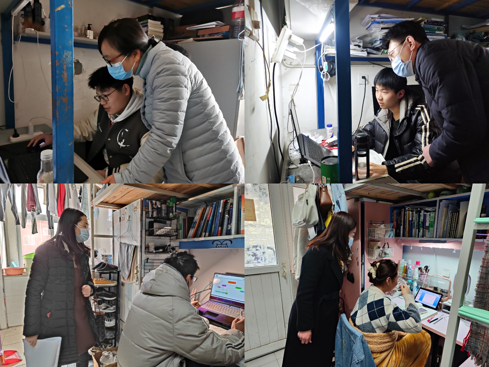 为广泛深入车院各寝室楼栋,领导老师们分批走访了桃园和李园宿舍。冯樱在桃四多间宿舍亲切叮嘱同学们要好好配合疫情防范工作,遵守学校的规定,做好寝室内部卫生、保持空气流通、坚持进出消毒等。她仔细观察了部分学生上网课的状态以及网络、硬件设备,鼓励大家要保持良好的学习心态、健康的身体,克服困难认真学习。李秀峰在走访过程中细心询问了同学们的听课效果,要求他们必须结合新的形势变化好好规划自己的学习进度和学习方式,将线上与线下学习相结合,严格自律、相互督促,班长、学习委员、寝室长都要带头以饱满的学习状态来引领大家。
