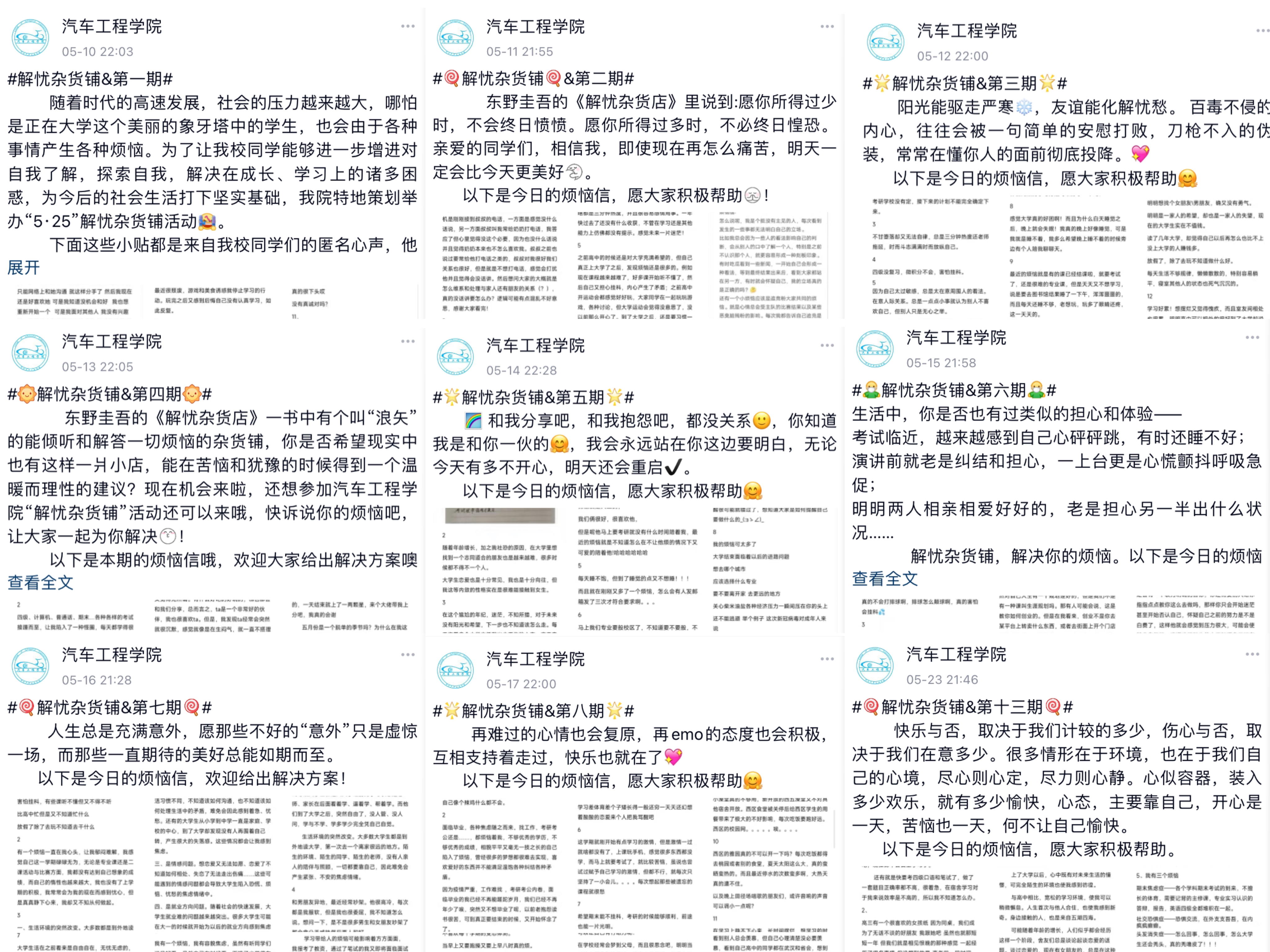通过线上形式公开匿名烦恼信,面向大众征集解决方法并给予解答。“解忧杂货铺”活动共分为十三期,随着活动的开展参与人数众多,赢得了各方支持和夸赞,同学们之间积极解忧互助,通过这种方式不仅表达了大家内心的温度,并让其心与心相连,携手共同走出困境。
