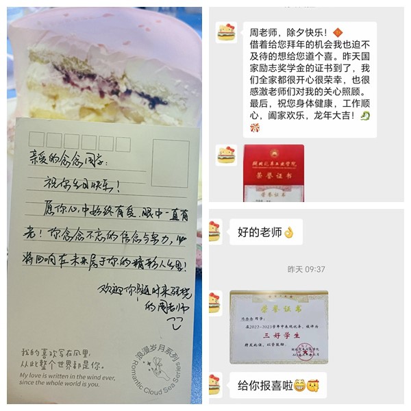 分党委副书记周彬的结对学生,她所在的205宿舍也是周彬的结对宿舍。结对大半年来,周彬时常与冯念念谈心谈话,了解生活学习中的困难,引导做好学业和职业生涯规划。2024年春节,在收到学院寄来的国家励志奖学金和评为校级“三好学生”后,冯念念第一个给老师报喜。近日,在谈话过程中得知3月6日是她的生日后,周彬当即决定为她和结对宿舍过一个集体生日,亲手为冯念念带上了生日帽,送上了生日蛋糕和亲手写的生日祝福。