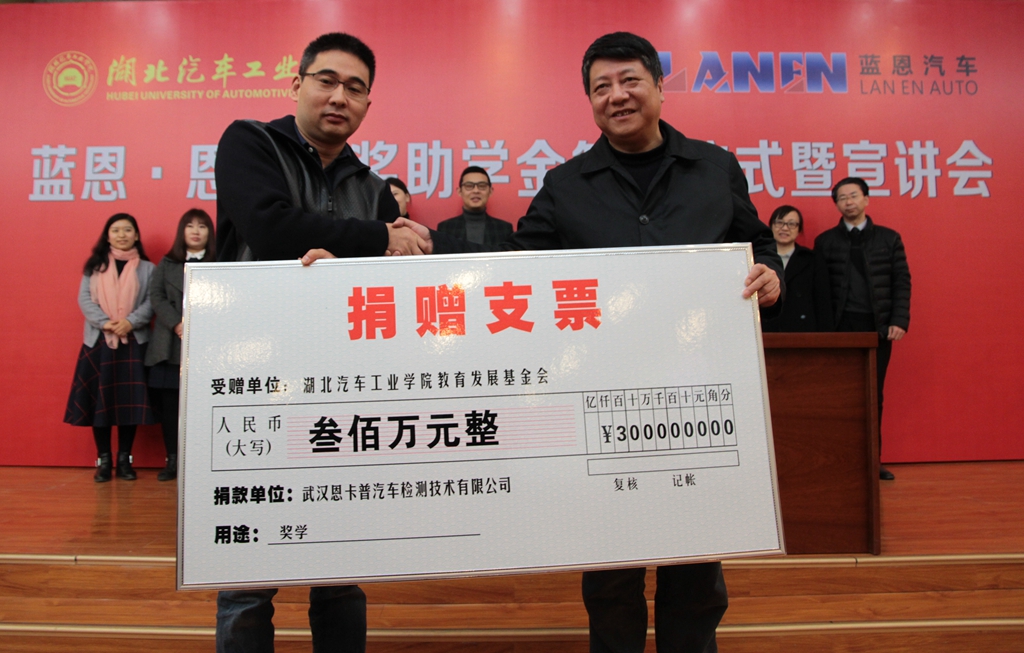 03届校友、武汉蓝恩新能源汽车产业发展股份有限公司董事长蒋武代表公司与母校在逸夫图书馆报告厅签订了奖助学金捐赠协议,为母校捐赠300万元设立“蓝恩·恩卡普奖助学金”,这也是做爱片