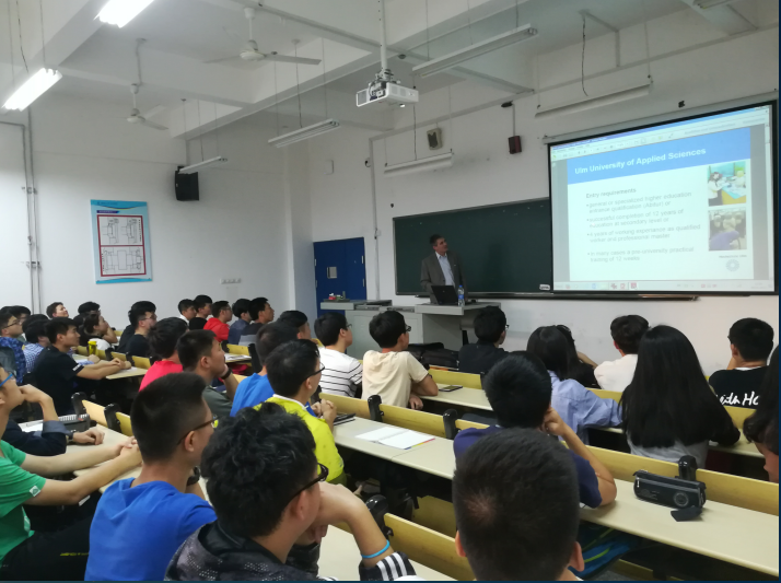 正在准备赴德学习的2014、2015、2016级学生作了专题讲座,对乌尔姆应用科技大学的地理位置、教育模式、专业设置、教学资源、科研设备和国际合作交流等作了全面介绍。在场学生也纷纷就自己感兴趣的话题用德语与Dr.Schrade教授进行了沟通,为有意赴德学习的学生全面了解乌尔姆应用科技大学创造了一次良好的机会。