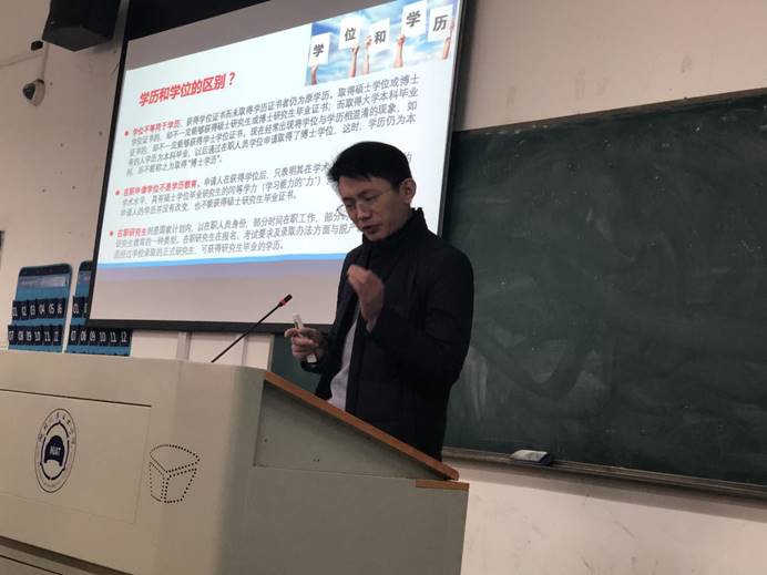 动员会上,李秀峰以PPT方式将17级的年级辅导员及班主任亲切可爱的照片展示出来,展现了学院老师与17级同学的浓厚师生情谊,引得现场一片热烈的掌声和笑声。随后他从学历学位常识、大学分类、学院毕业生考研情况、问题和建议四个方面进行了深入浅出的动员讲话。他强调了学历学位在终身职业发展中的重要作用,分析了当前国家高等教育发展形势和高校的分类,引导学生充分了解高校层次、进行合理定位,并以详细的统计数据和车院学子近五年考研录取情况加以分析,劝导大家理性思考、慎重选择。他还结合往届学子一个个鲜活的考研案例,分析了作为汽院学生在就业、考研、留学等方面的基础和优势,同时结合《汽车产业中长期人才发展研究报告》有关内容,鼓励同学们认清自我定位、树立充足自信,以更高标准对待自己的学业和将来的职业,积极选择考研深造。在考研问题和建议剖析部分,他要求同学们一定要思考和明确考研动机、学习能力、家庭条件、个人定力等问题,鼓励同学们利用即将到来的寒假,主动与父母进行沟通,尽早制定考研规划,“只争朝夕、不负韶华”,以奋斗之青春赴理想之未来。