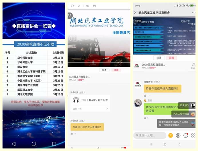 积极调整工作方式,经过前期准备,于3月25日晚上八点至九点半,通过襄阳知名教育品牌鸿儒教育提供的“高校大直播”平台,以网络直播的方式为襄阳地区的高三学生和家长开展了一场专题招生宣讲会。