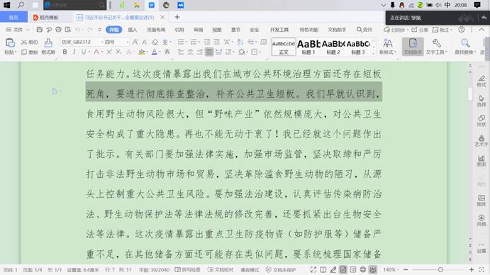 各班团支书主持活动,通过视频观看学习了习近平总书记关于生物安全、公共卫生安全重要论述文件,加深了同学们对生物安全的相关认知对公共卫生的重视,同时要求同学们做到坚决革除滥食野生动物的陋习,呼吁同学们警示身边亲属朋友严禁滥食野生动物,注重个人行为保护公共卫生环境。活动还组织同学们观看了国家安全宣传片和《当监察法遇上孙悟空》,通过视频让学生更好的了解国家安全的相关知识,明辨各类有害国家安全的不正当行为,树立共同维护国家安全的意识,普及了同学们国家安全的相关法规加强了同学们的法律观念。最后,各班分别开展了加强公共卫生安全的相关问答交流环节,通过问答、分享、思考来提高大家的公共卫生安全意识,也极好地加强了班级凝聚力的提升。部分同学还结合疫情期间的切身经历分享交流了自己的防护防控小知识,严谨又活泼的氛围让整个团日活动充满朝气。