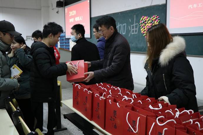 分团委书记胡霄寒主持会议,她首先指出了此次活动开展的目的和必要性,强调了考研对人生发展的重要性,并总体分析了学院近三年的考研和本科就业情况。接着,参会人员集体观看车院考研祝福视频,来自不同年级学弟学妹们的真诚祝福缓解考研学子内心的紧张和不安,伴随着现场的低年级学生们齐声高呼“学长学姐,考研加油!”,考研学子们用热烈的掌声回应了这嘹亮的祝福声。随后与会的老师们还为考研学子一一送上了学院精心准备的“考研加油包”,精美的笔记本、甜蜜的糖果、温馨的祝福卡片、轻便的油笔让每个学生感受到了沉甸甸的暖意,每一句鼓励、每一声叮咛、每一个微笑都像无形的太阳温暖着大家的心田。接受爱心礼包后,车辆176张德俊作代表考研群体进行了简短的发言,表达了所有考研人冲刺的决心和信心。李秀峰在总结中通报分析了今年的报考形势,鼓励大家在严峻的形势中把握住自己的机遇,并谈到“考研的过程就就是一个坚持奋斗的过程,道阻且长,只有坚持到最后的才会胜利。剩下不到一个月,无论有任何困难,及时向学院反映,车院永远都是大家最坚强的后盾。我们坚信,你们一定会收获希望,成功上岸!”