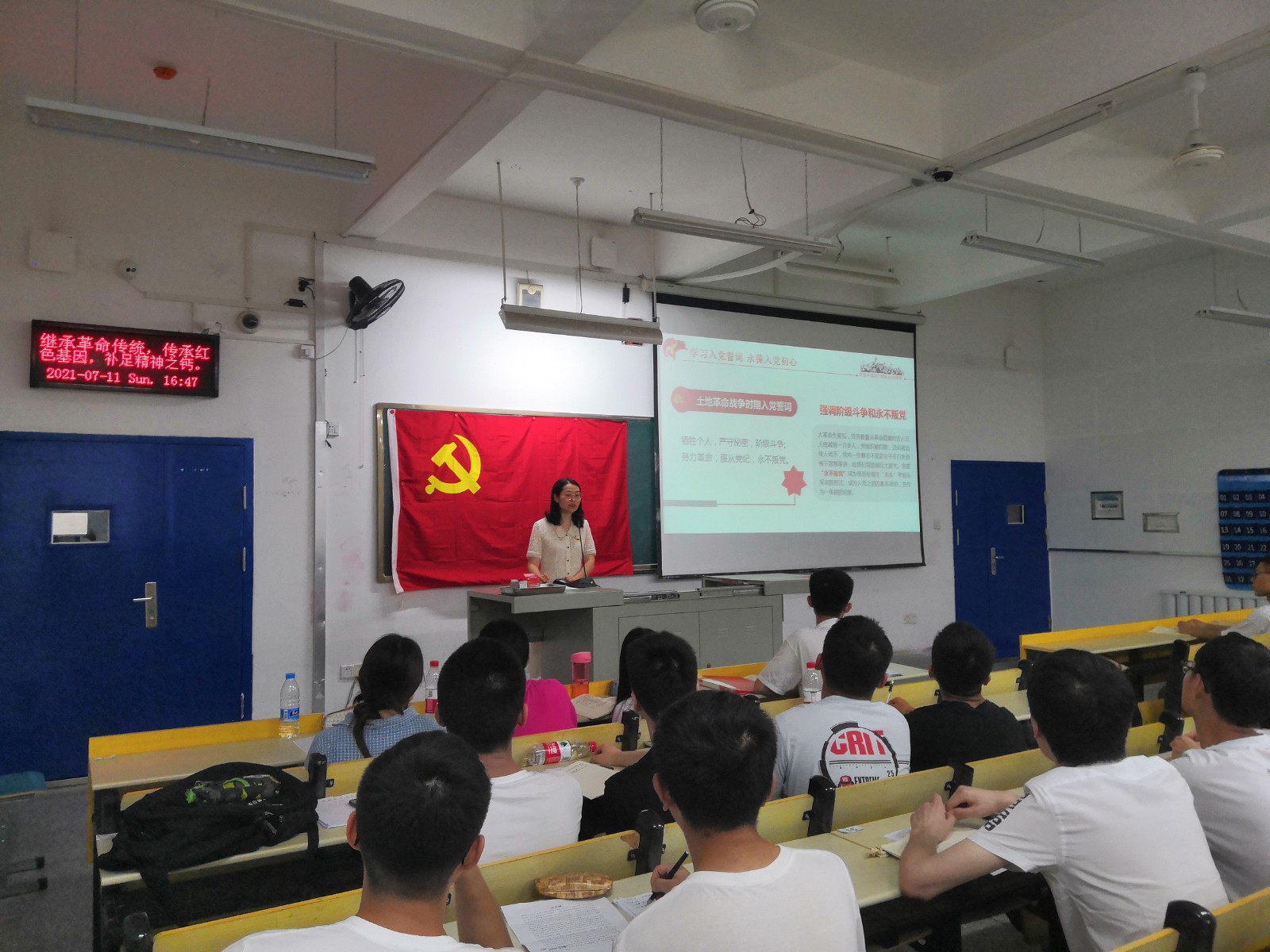 学生党支部在6217教室举行了七月份主题党日活动暨党史学习教育专题组织生活会,分党委副书记杜昕俊向全体党员讲授《从入党誓词领悟党员的初心和使命》专题党课。活动分为三个阶段进行,由学生党员杜新宇主持。