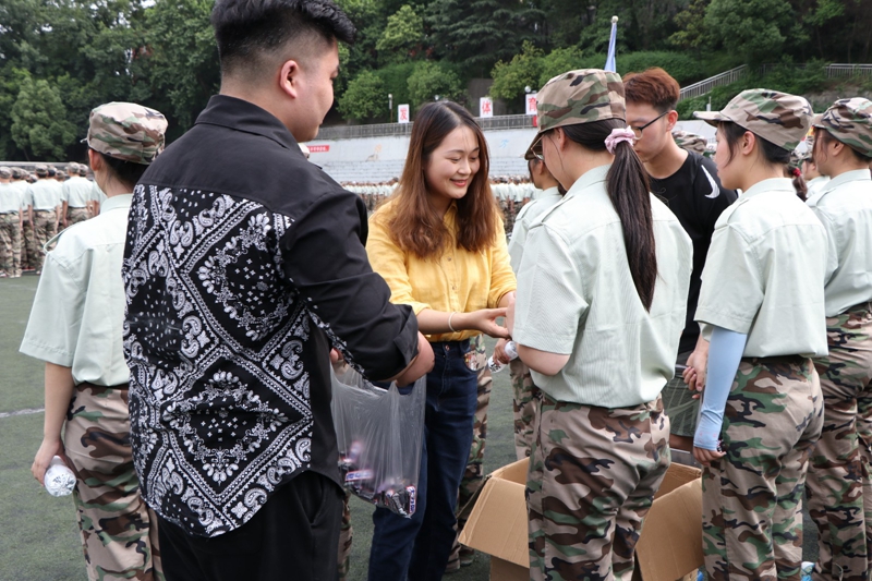 随后,杜昕俊带领着老师、学生干部们将300多瓶不同品类的饮料和补充能量的士力架一一送到了学生们手中,军帽下绽放开了一个个清甜的微笑。此次的军训慰问活动,不仅为烈日下的学生们送来了清爽缓解了疲劳,也提高了学生们对学院的认同感和归属感,更展现了学院以学生为本、为学生着想的关怀理念。