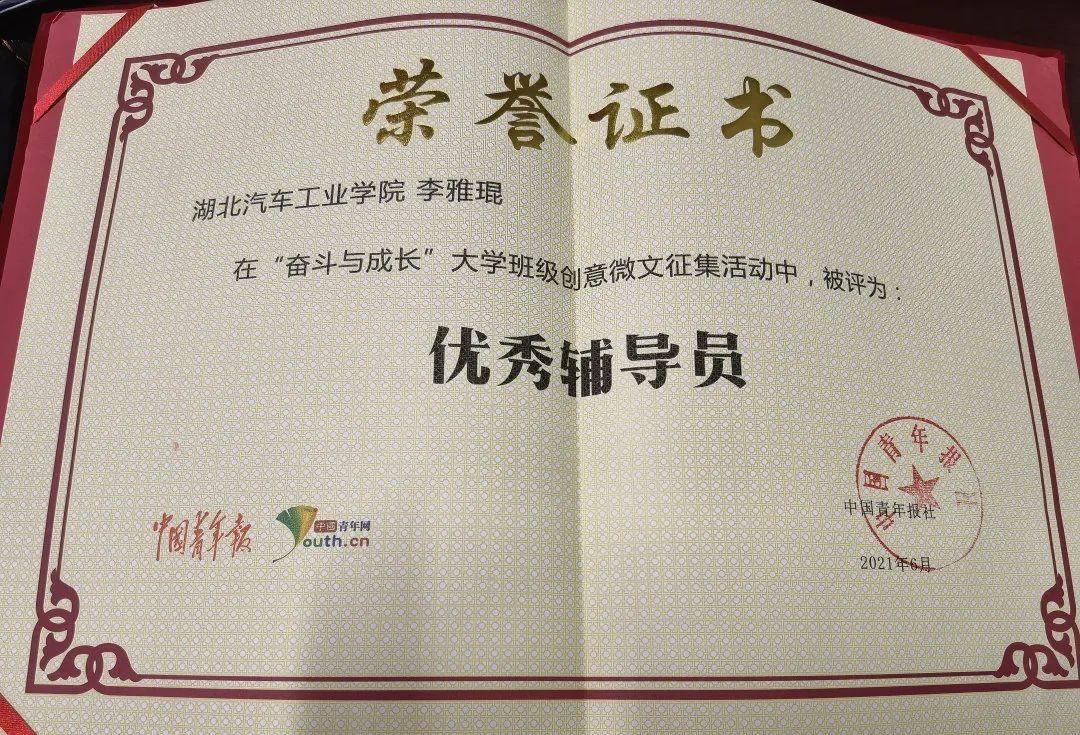 荣获中国青年报社“奋斗与成长”大学班级创意微文“优秀辅导员”称号,连续多年被评为学校“优秀班主任”“优秀党务工作者”“就业先进个人”。