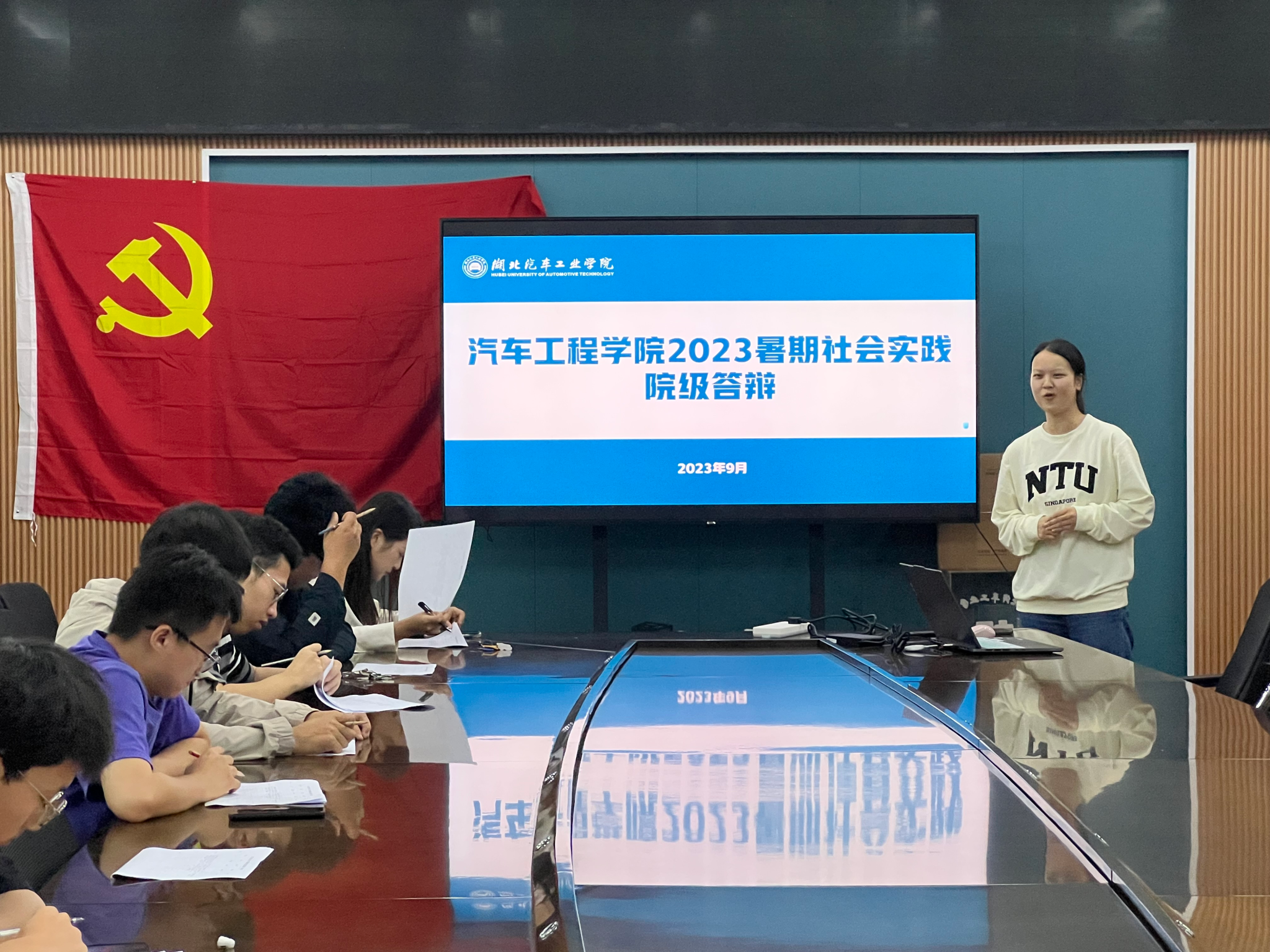 在学院二楼会议室举行2023年暑期社会实践答辩会。分团委书记李雅琨及2022年部分社会实践优秀团队队长担任答辩评委。