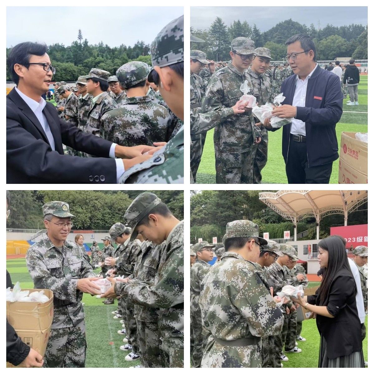 分党委书记杨亚会、副书记周彬,及学工办全体辅导员在大操场向参训新生们送上节日的亲切问候,对他们在军训期间所展现出的坚韧不拔的优良品质给予了充分的肯定,鼓励他们将军训的成果和收获传承发扬到接下来的学习与生活中,不负韶华,度过充实的大学生活,并为同学们送上了香甜可口的月饼和牛奶,与全体新生提前过了一个特别的中秋。