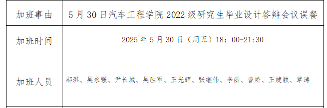 由于研究生毕业设计答辩要求,需要当天完成,特安排中午加班工作。误餐人员如上图。公示三天,如有疑问可咨询教学科研办公室0719-8239880.
