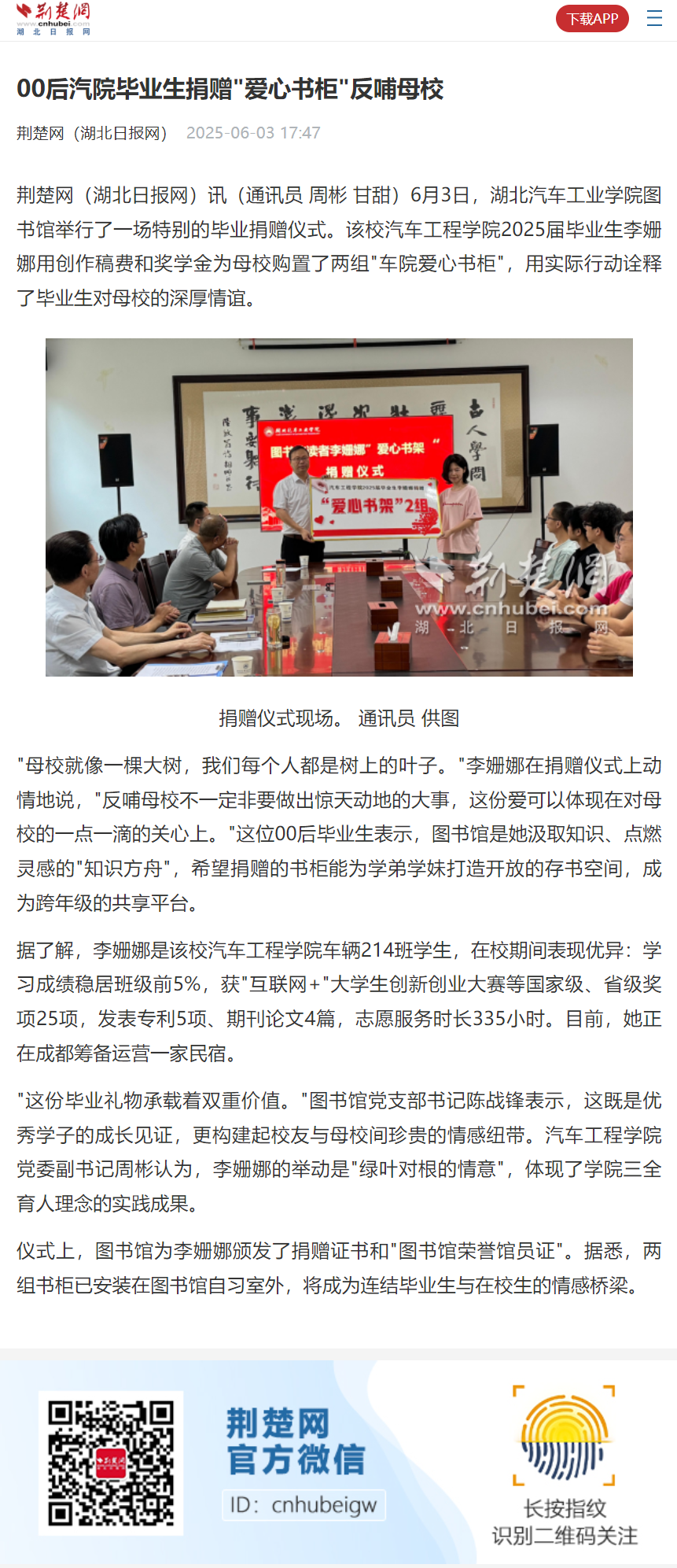 【荆楚网】00后汽院毕业生捐赠"爱心书柜"反哺母校