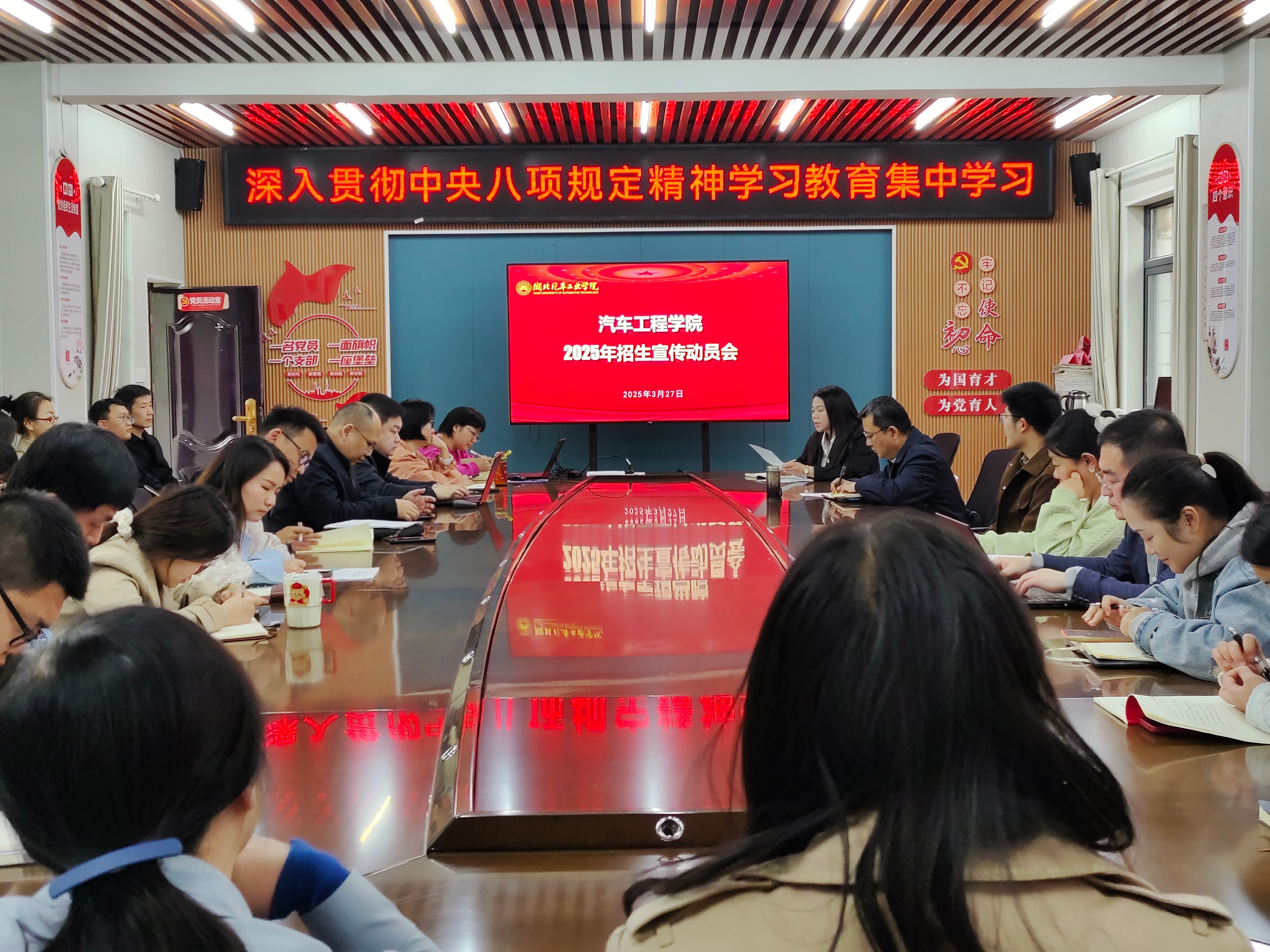 在会议室召开了2025年招生动员大会,全面部署本年度本科生和研究生招生工作。学院在校领导班子成员以及50多名教职工参与本次会议,党委副书记周彬主持会议。