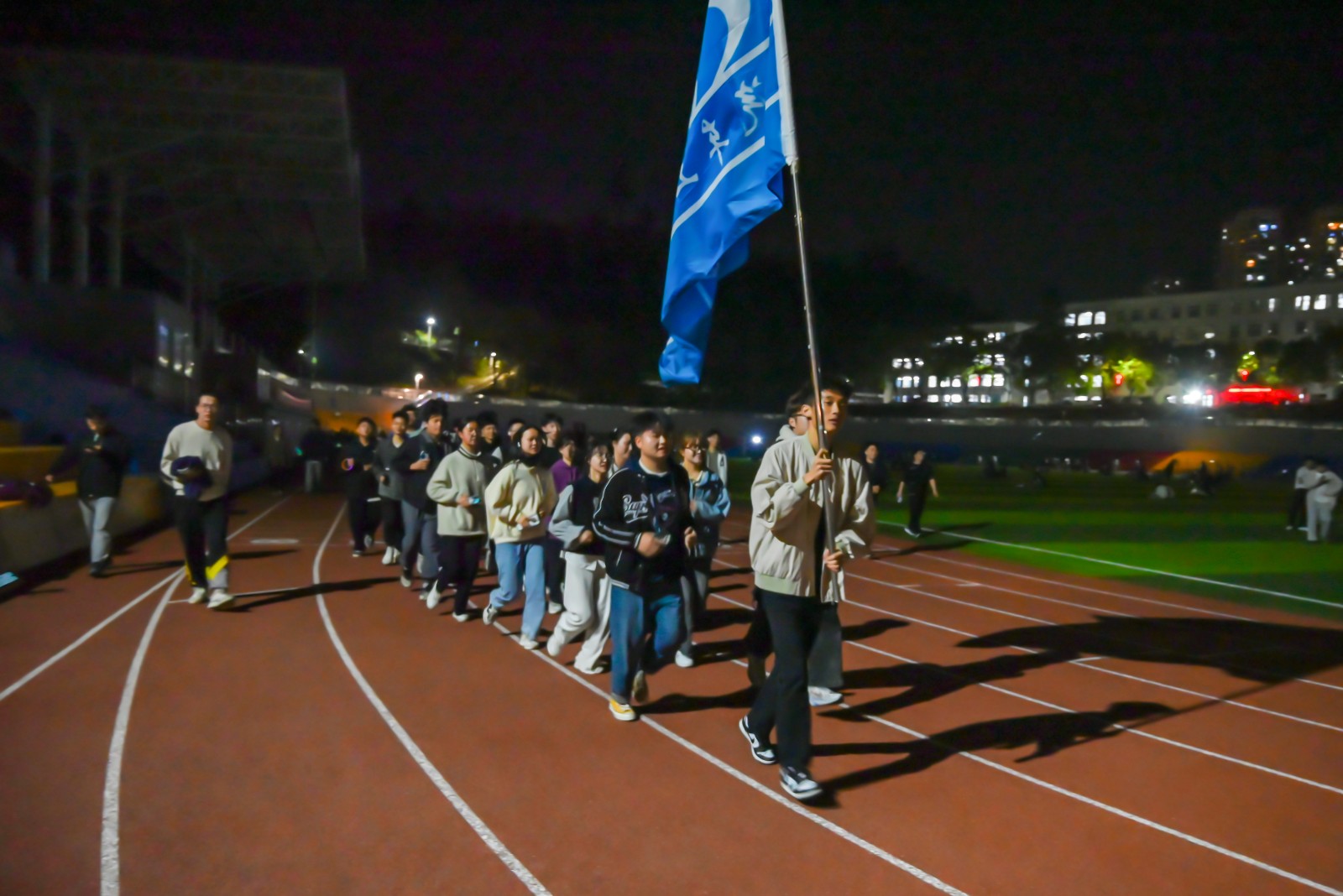 学生会全体学生干部齐聚操场,迈着整齐的步伐,手持院旗,在田径场上列队奔跑。